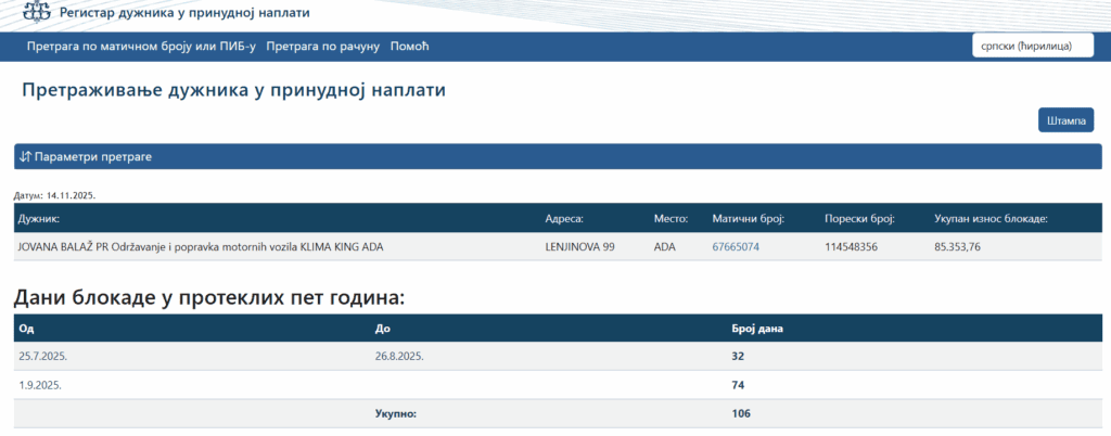VLASNICA BEŽI OD IZVRŠAVANJA OBAVEZA, RAČUN IM JE BLOKIRAN VIŠE OD 100 DANA